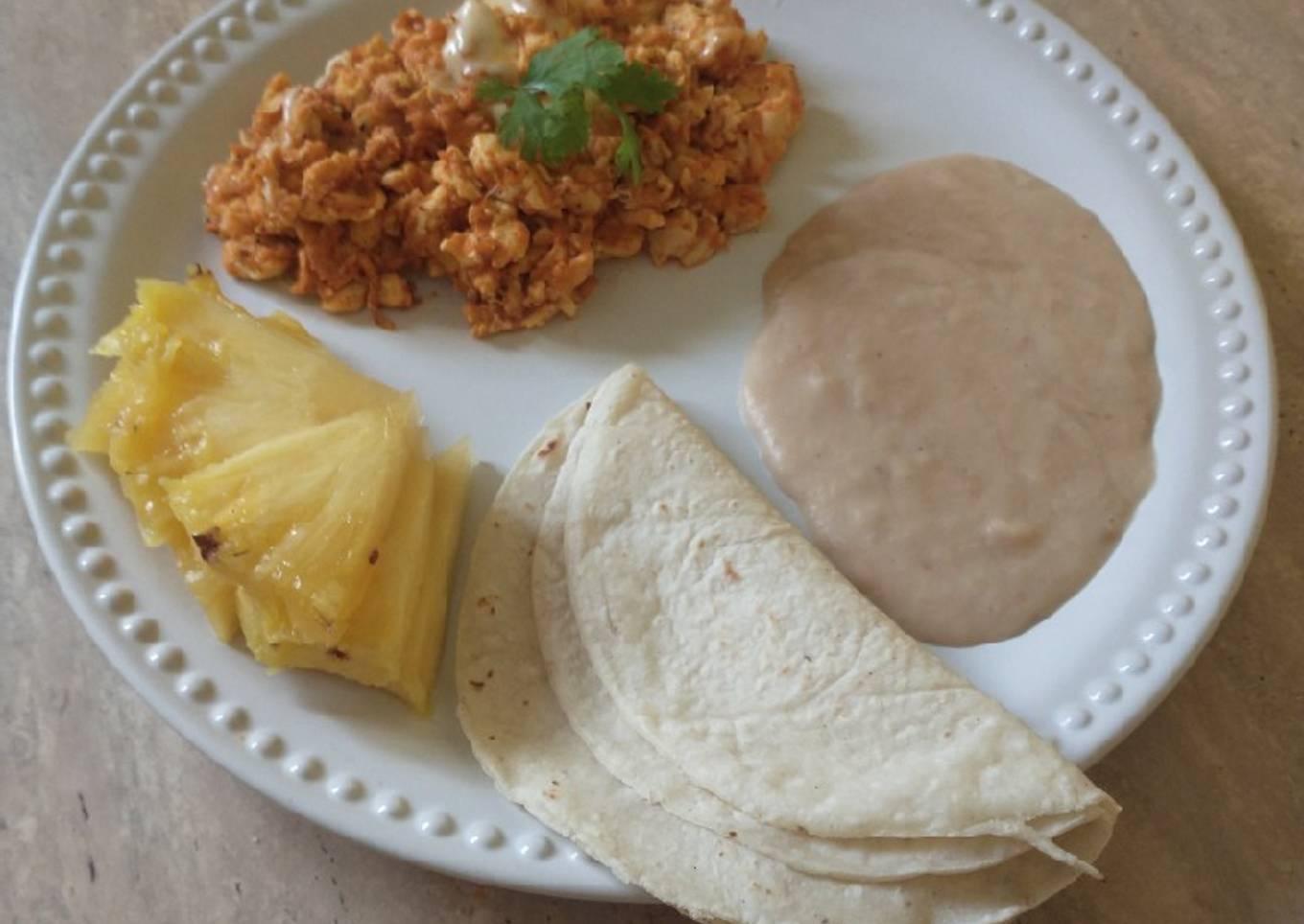 - Por último, acompáñalos con frijoles y alguna frutita que tú quieras.