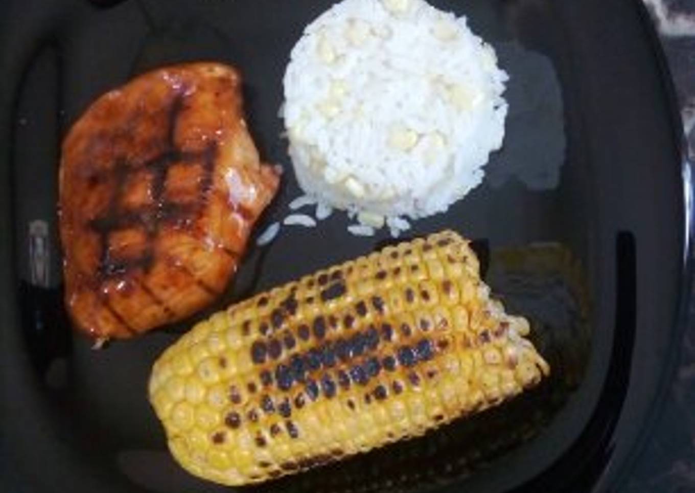 - Poner arroz, la pechuga y una mitad de elote por plato, si aún te queda marinado baña de nuevo tus pechugas ya en el plato
