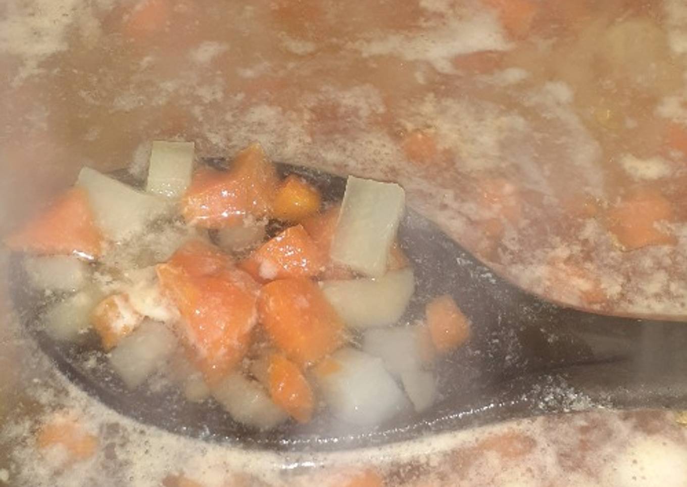 - Pele las papas y las zanahorias, y córtelas en cubitos para que sea más fácil su cocción, en el caldo que quedo del pollo ahí pondrá a hervir las verduras y agregar la pizca de orégano y pimienta al gusto. Rectifique la sal.