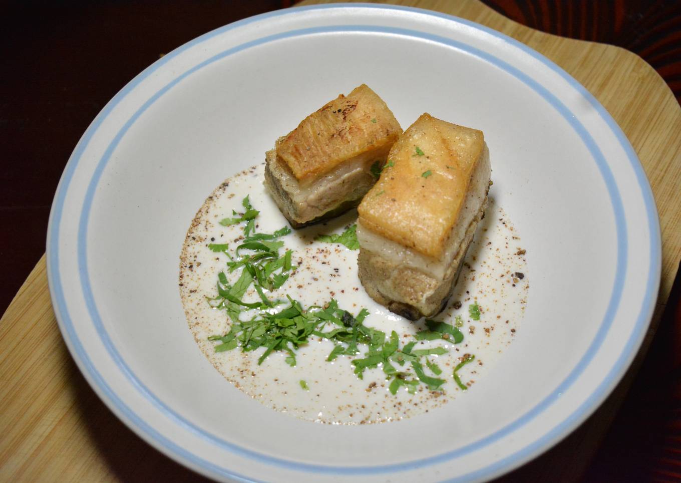 Corte de costillas de cerdo con salsa bechamel (carnitas gourmet dicen por ahí)