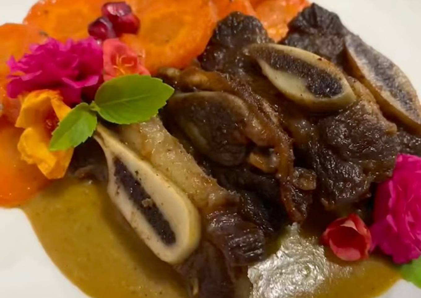 Costillas de res confitadas acompañadas de una salsa de guaje con vino rosado
