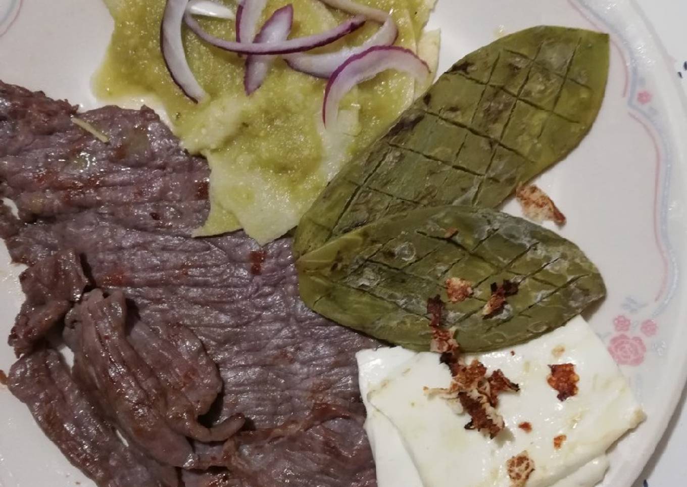 - Forma tu plato con un bistec de cecina, dos nopales asados, dos rebanadas de queso asado y dos enchiladas.
