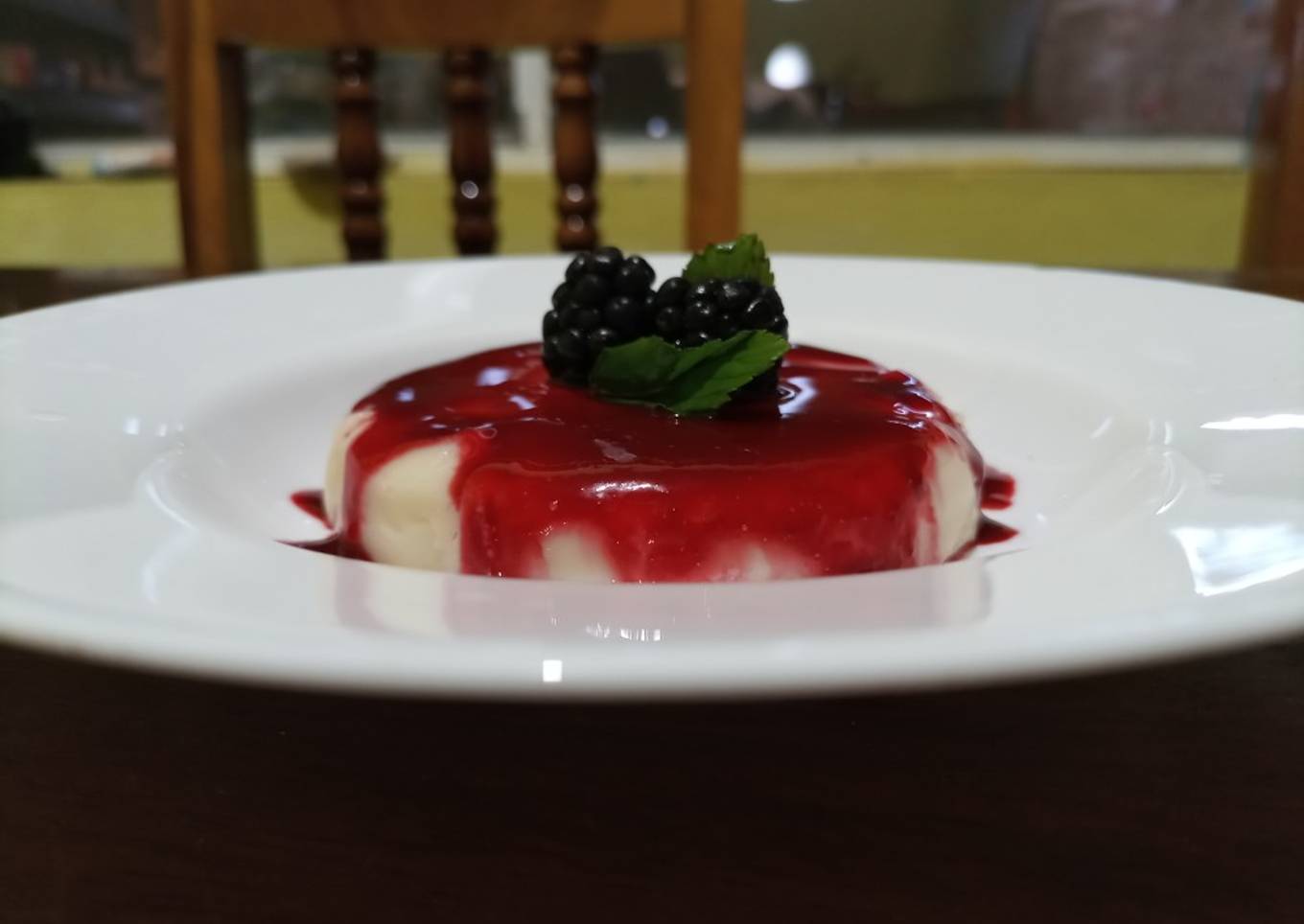 - Vaciamos nuestra panacota en nuestro plato, decoramos con el coulis, zarzamoras y hojas de menta y listo una dulce panacota para disfrutar